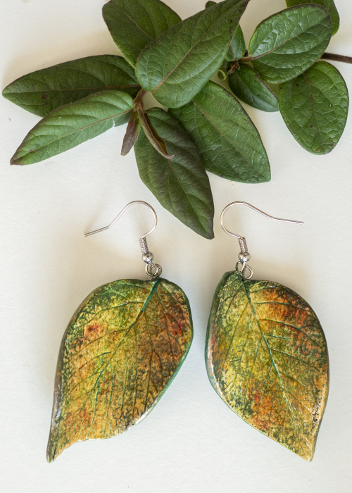 Bijuterii ușoare modelate manual din pastă de hârtie, inspirate din formele frunzelor.