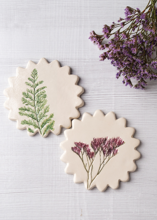 Fie că sunt farfurioare, suporturi de pahare sau mici tablouri, fiecare poartă urmele frunzelor și florilor care le-au inspirat.