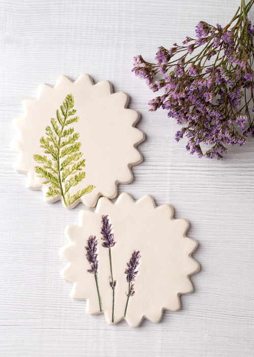 Imprimate cu plante reale, aceste suporturi de pahare sunt modelate manual din lut cu uscare la aer și finisate cu lac transparent pentru protecție.