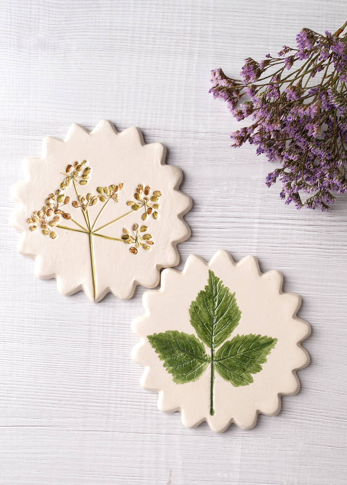 Imprimate cu plante reale, aceste suporturi de pahare sunt modelate manual din lut cu uscare la aer și finisate cu lac transparent pentru protecție.