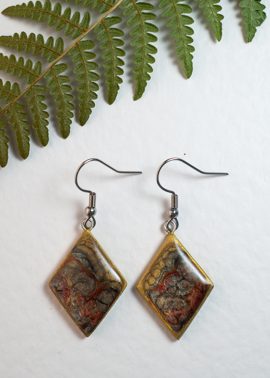 Fiecare pereche de cercei din colecția Armonia este unică, realizată manual dintr-un material natural (lut uscat la aer), pictată cu vopsele speciale și finisată cu rășină, pentru rezistență și strălucire.