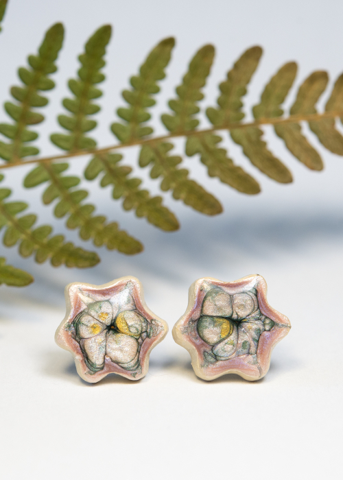 Fiecare pereche de cercei din colecția Armonia este unică, realizată manual dintr-un material natural (lut uscat la aer), pictată cu vopsele speciale și finisată cu rășină, pentru rezistență și strălucire.